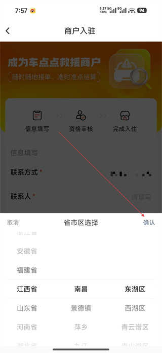 3、选择所在区域时点击区域选择框,在弹出的省市区列表中挑选对应地区,确认选择后点击确认按钮,完成所在区域的信息填写。