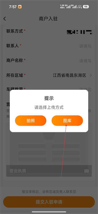 4、提交营业执照时根据提示选择上传方式,可选择拍照实时获取执照图片,或从图库中选取已保存的执照图片,完成材料上传步骤。