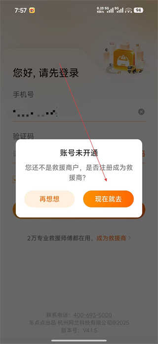 1、打开点点救援应用,登录时若提示账号未开通,可选择现在就去注册成为救援商户,进入商户入驻流程,开始提交相关入驻信息。