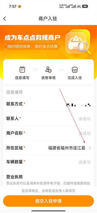 2、进入商户入驻页面依次填写联系方式联系人商户名称等信息,选择所在区域,填写车辆数量,准备好营业执照相关材料待提交。