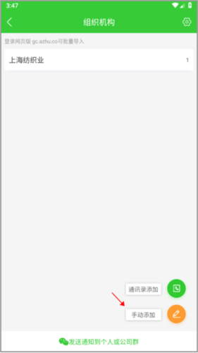 3、以手动添加为例,输入员工的手机号,个人信息以及所在部门等,添加好后点击下方“添加并发短信……”,这样员工就会收到这份短信,你也添加成功了。