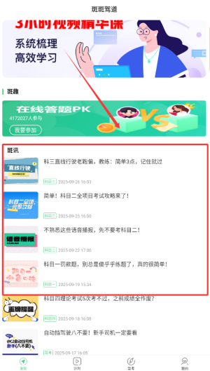 3、题库更新完成后,进入“发现”页,可使用计时课程、VIP课程等驾考学习功能。