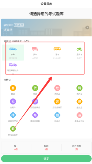 1、打开斑斑驾道定制版App选择学车城市(含地方题库)、驾驶证类型(如小车C1)及对应科目。