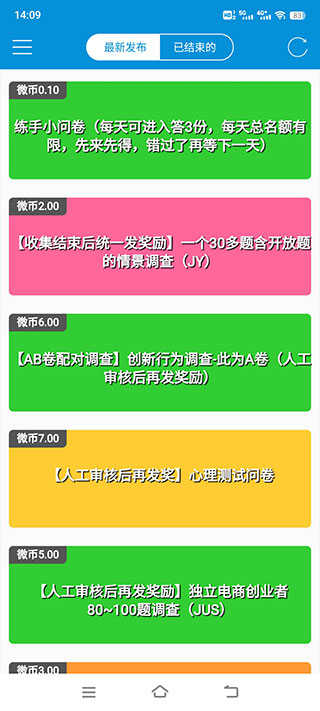 2、然后就可以看到各种各样的文卷调查,每个问卷左上角还对应相应的金额和酬劳。