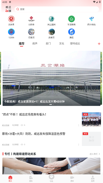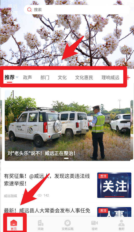 2、在首页页面,系统提供推荐、政声、部门、文化等多种栏目,用户可以自由切换分类,实时浏览威远本地的最新新闻与资讯动态。