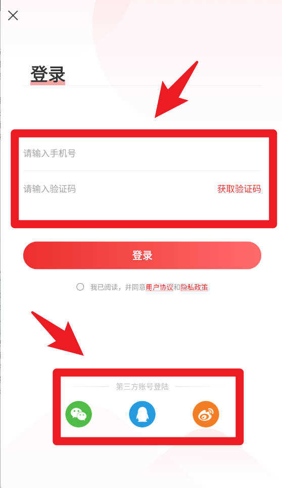 1、用户在登录界面可选择输入手机号并获取验证码完成登录,也可以直接通过微信、QQ或微博第三方账号一键登录,确保快速进入平台。