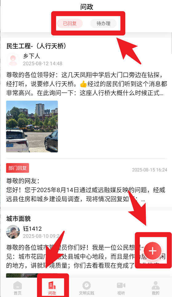 4、在问政板块,用户可点击加号按钮提交问题,查看待办理或已回复事项,方便与相关部门沟通互动,推动问题高效解决。