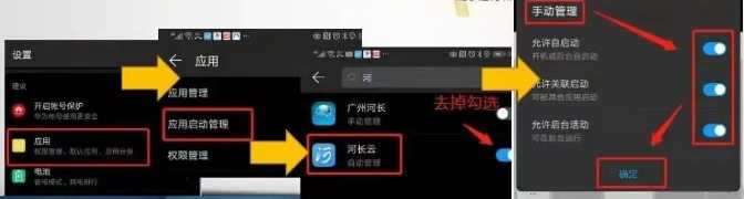 以华为系统设置为例,设置-应用-应用启动管理-河长云-手动管理