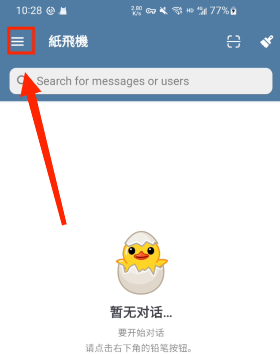 1、打开Telegram软件,点击左上角的三横线菜单(汉堡菜单)。