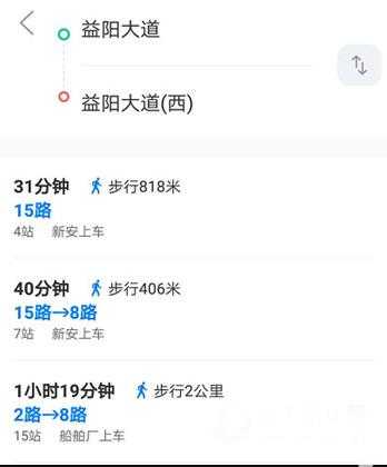 2、然后益阳行手机版就会显示这条路线乘坐的公交车和具体步行步数了,非常简单,选择一个具体路线即可