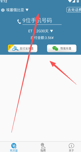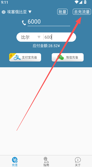 2、来到充值页面以后,点击右上方的去充流量选项。