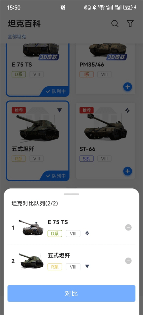 2、点击“+”选择两辆坦克进行性能对比;