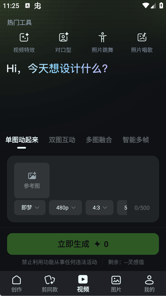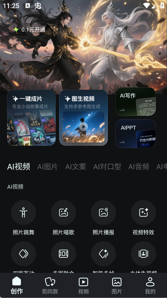 进入App创作页,能一键成片、图生视频,还能通过照片跳舞/唱歌等AI视频功能,轻松让静态素材动起来。