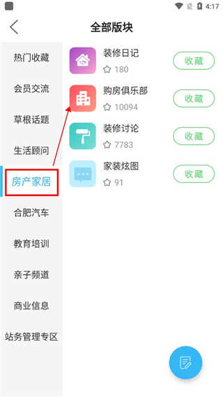 2、在板块界面选中“房产家居”,然后选择“购房俱乐部”。