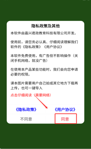 1、首次使用需点击同意用户协议,并进入应用主界面,开启学习流程。