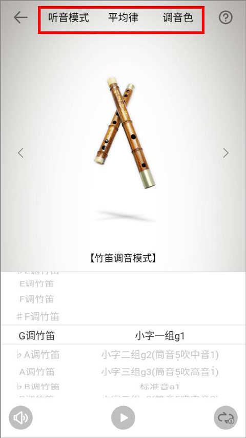 3、进入竹笛调音页面,有听音、十二平均律、调音色三种模式,用户按照需求选择其中一种模式;