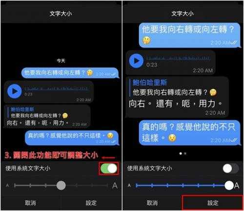 2、接著将「使用系统文字大小」的功能关闭,就能自行移动下方的横杆,选择合适的字型大小,最后按下「设定」即可。
