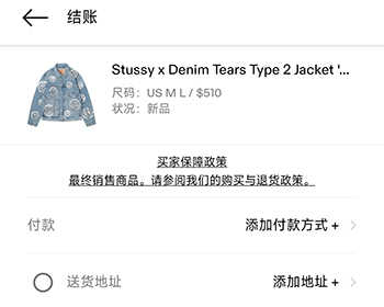 3、进入结账页面,选择付款方式,添加地址,付款后即可购买。