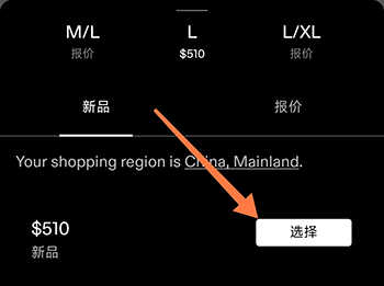 2、进入商品详情页面,选择尺码,找到价格点击右边的选择;