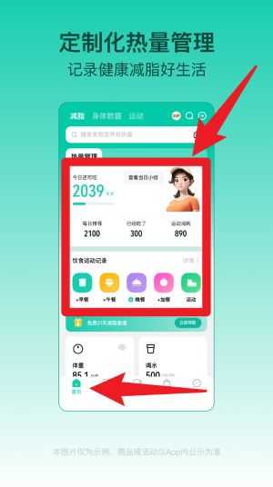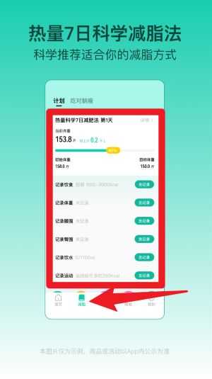4、点击下方“减脂”按钮可开启7日科学减脂法,每天记录饮食、睡眠、体重和喝水情况,科学推进瘦身。