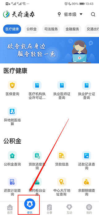 2、点击app主页下方中的“便民”即可查看所有网上办事的入口,按照分类查找自己的所要办理的服务即可;