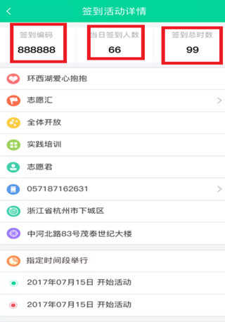 (3)点击活动,可查看签到编码、当日签到人数和签到总时长。