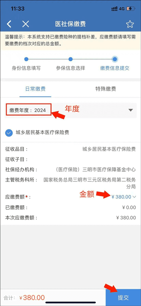 4、仔细核对2025年度缴费金额,点击【提交】。