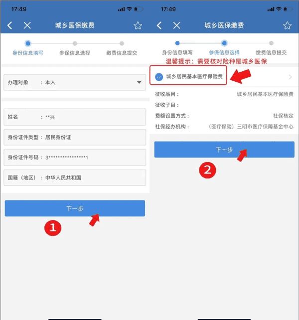 3、仔细核对页面信息无误后,依次点击【下一步】再点击【提交】。(温馨提示:需要核对险种是城乡居民基本医疗保险费)