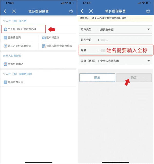 2、城乡医保缴费的页面打开后,点击【个人社(医)保缴费办费】,在页面输入正确的证件号码和姓名等信息,点击【确定】。(温馨提示:姓名需要输入全称)