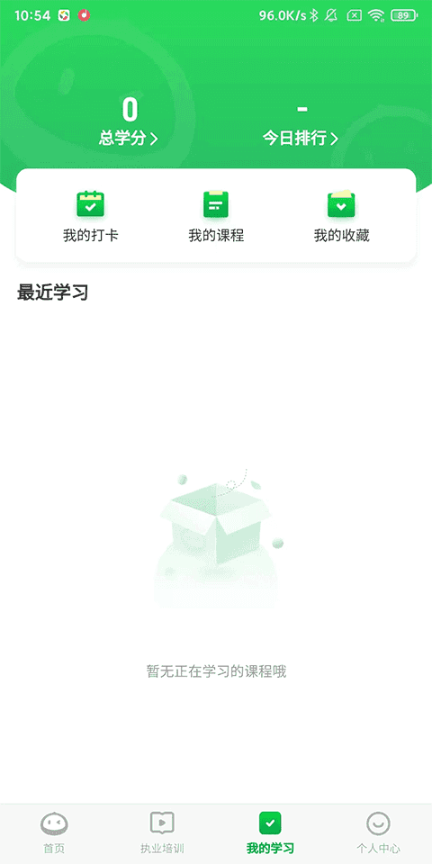3、我的学习:打开、课程、收藏以及最近学习记录,记录总学分、当日排行;