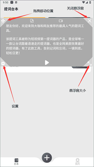 4、在提词时,悬浮窗还可以自由拖拽位置、随意调到悬浮窗大小、设置字体大小、透明参数等等;