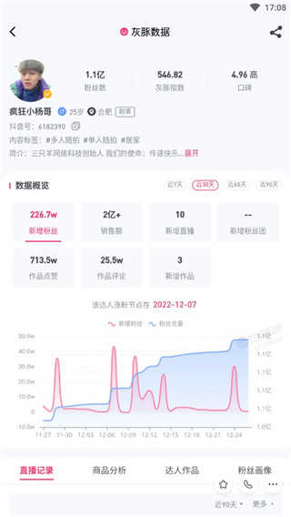 4、在这里,用户可以查询到主播时间、粉丝、销售额等各种账号数据,非常全面。