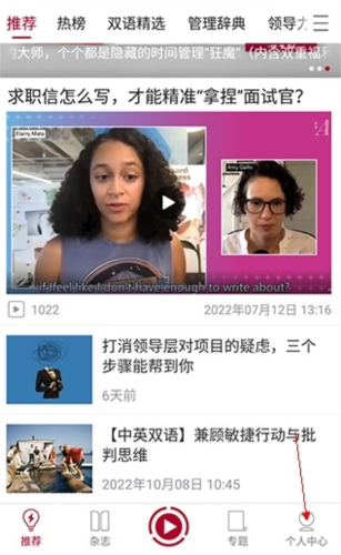 1、进入哈佛商业评论app首页后,点击【个人中心】。