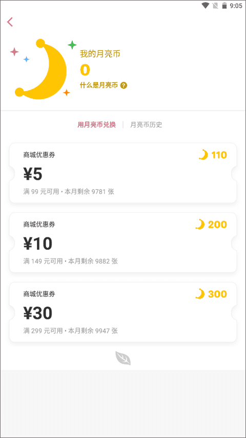 2、兑换购买商品时的优惠券(如:300月亮币可兑换30元优惠券);