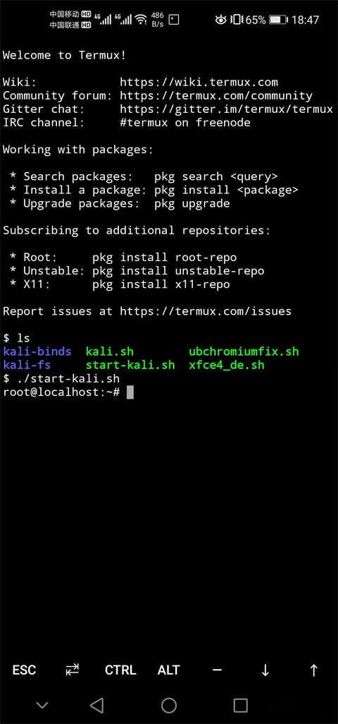 7、目录下的 start-kali.sh 文件就是我们安装的 Kali 系统的启动文件,所以我们输入命令 ./start-kali.sh 启动系统: