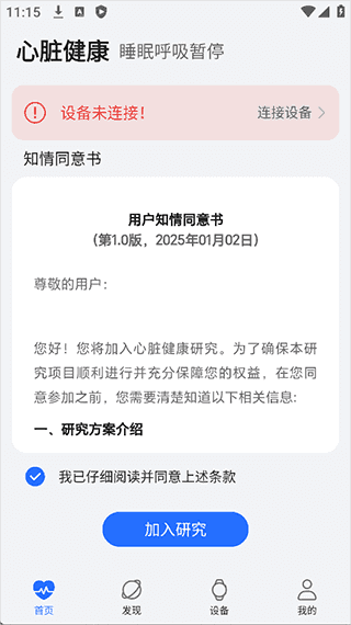 5、符合条件用户可自愿参与心脏健康研究计划,签署电子知情同意书后开启长期健康数据追踪。