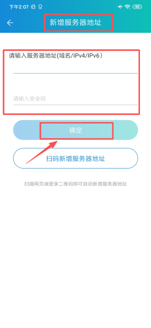 3、输入服务器地址与安全码后确认,即可成功添加新服务器。