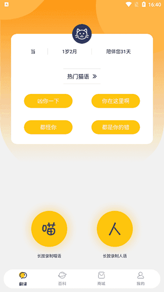 可以录制猫咪的叫声或者人的语音来进行翻译,可以在热门猫语里查找有趣的话术。