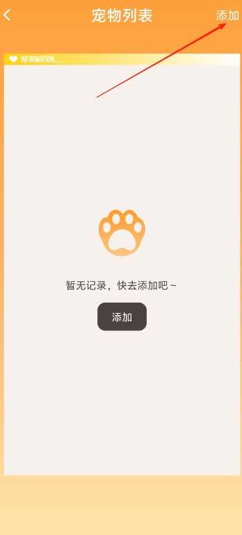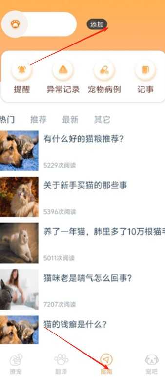 1、下载并进入猫语猫咪翻译器在指南界面点击添加,即可进入宠物档案天剑界面进行下一步操作。