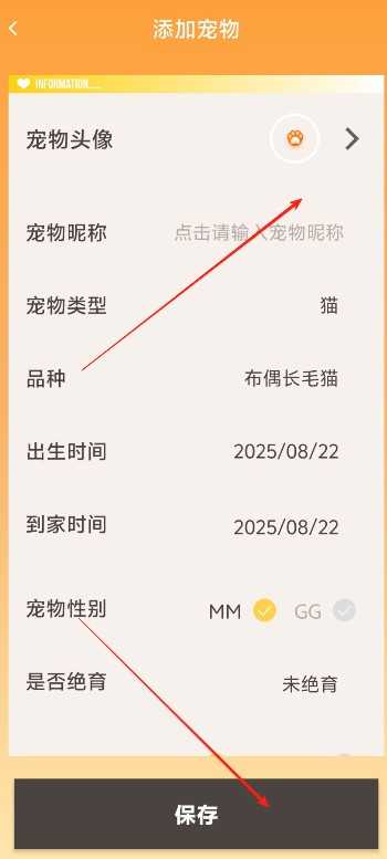2、用户在宠物列表界面点击右上角添加,输入宠物昵称、类型以及宠物头像等信息点击保存即可成功添加。