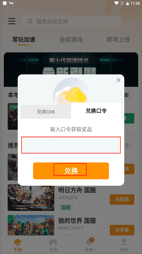 3、从默认兑换CDK切换到兑换口令,输入你早已得到的口令号码,全部输入好后点击下方的兑换按钮即可兑换成功。