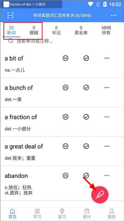 1、打开悬浮记单词app,登录进入首页,在首页中的新词、模糊中可以默写单个单词,点击单词右侧的写字图标;