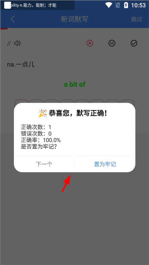 3、默写完成后用户可看到默写是否正确,可将单词设置为牢记或者点击下一个继续默写。
