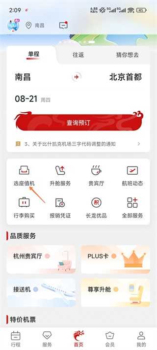 1、打开长龙航空手机App,点击选座值机