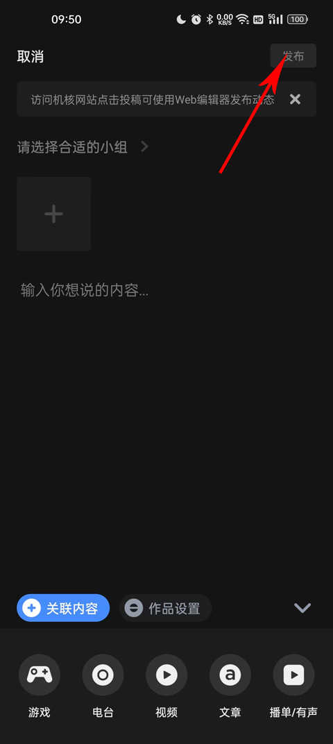 3、来到发布内容中心之后,填写你需要发布的话题和你想说的内容,最后找到你要发布的类型,最后点击右上角的发布就可以了。