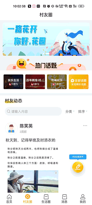 3、如果想多多认识附近的村民的话,就可以点击下方的村友圈,就可以去和村内好友互动了,还可以参与到村内的事物管理呢;