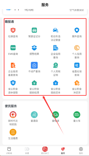 3、服务板块提供社保信息、驾驶记分、案件进度、个人信用及不动产等查询功能。