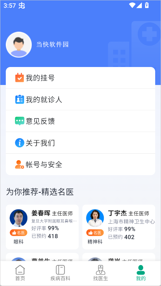 1、下载安装好上海市医院预约挂号平台app,打开软件登录之后,点击“我的”里面的就诊人管理功能。