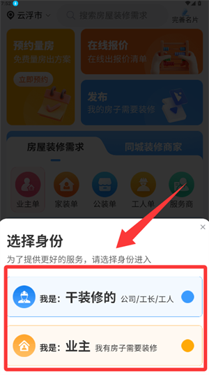 2、进入身份选择页,根据实际情况选择装修从业者或业主身份。