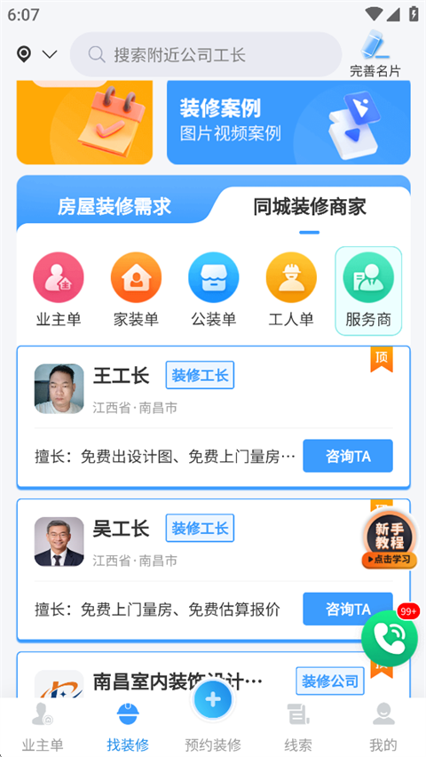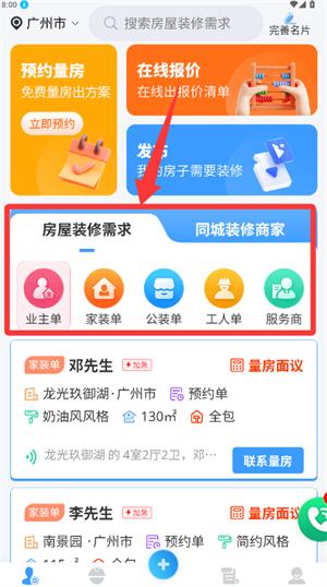 3、在首页房屋装修需求板块,可业主单、家装单等类型需求。